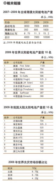 2009年,全球太陽(yáng)電池產(chǎn)量前10名公司的產(chǎn)量合計(jì)為5612.3MWp,占全球總產(chǎn)量的56%。其中,在全球前10名的企業(yè)中有4家來自中國(guó)大祟,分別是尚德、英利、晶澳和天合,這4家企業(yè)在2009年的產(chǎn)量合計(jì)為2088.3MWp。中國(guó)太陽(yáng)電池產(chǎn)量在2009年達(dá)到4GWp,占全球總產(chǎn)量的40%,居世界首位。