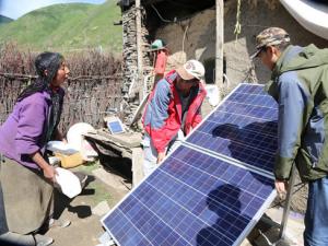圖為:施工人員為藏族婦女窮群瑪家安裝太陽能光伏發(fā)電系統(tǒng)。