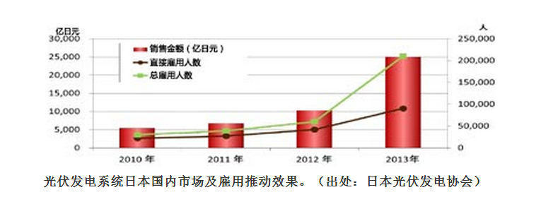 日本光伏發(fā)電協(xié)會表示,因可再生能源電力固定價格收購制度的開始實行,日本光伏發(fā)電系統(tǒng)市場迅速擴大,從2011年度的約6700億日元,到2013年就達到了2.5萬億日元左右。這里所說的光伏發(fā)電系統(tǒng)市場,除了光伏板,逆變器,受變電設(shè)施,架臺及接線盒等設(shè)備,還包括土地平整,基礎(chǔ)施工,安裝及配線等施工以及設(shè)計和管理等系統(tǒng)設(shè)置相關(guān)事業(yè)。