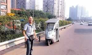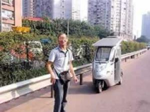 發(fā)明電動(dòng)三輪車的章大伯對(duì)違規(guī)上路試車很慚愧 年過6旬的章大伯一直有顆奔馳的心,但由于年歲大了,怕過不了駕考,于是他自己動(dòng)手做了輛太陽能電動(dòng)車。前兩天,他開著剛做好的“座駕”上了城市快速路,想體驗(yàn)一下加速度帶來的快感,沒料,碰上了交巡警。 電動(dòng)三輪車,開進(jìn)了