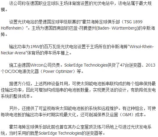 德國(guó)逆變器(PCS)廠商SolarEdge Technologies公司10月13日宣布,德國(guó)職業(yè)足球隊(duì)基地設(shè)置的輸出功率1MW的百萬(wàn)瓦級(jí)光伏電站采用了其逆變器和太陽(yáng)能電池板的監(jiān)視服務(wù)。