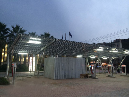 左側(cè)的特斯拉超級充電站仍秉持了其在美國的風(fēng)格,整座充電站類似鋼結(jié)構(gòu),上面有個(gè)斜坡式平頂,其上全部覆蓋太陽能電池板,4個(gè)超級充電樁全部美國原版引進(jìn)。充電樁上下窄、左右寬,呈長方形鏤空狀,乳白色為主基調(diào),內(nèi)圈則鑲嵌著大紅色,十分醒目。在特斯拉充電站右側(cè),昊坤提供的8個(gè)通用充電樁,分為快慢兩種,電流分別為32-64A。