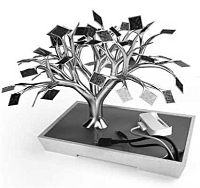 太陽能充電樹的外形酷似一棵盆栽的小樹,它的底部是瓷質(zhì)花盆,樹干可以隨意旋轉(zhuǎn),樹葉則是若干光伏面板,其傾斜角度可以改變。在接受太陽光的照射后,這些太陽能板就會將太陽能轉(zhuǎn)化成電能存儲在花盆內(nèi),用來給手機(jī)、數(shù)碼相機(jī)等移動設(shè)備充電。由于電池容量較大,所以太陽能充電樹需要在陽光下曬上總計約36個小時才能充滿電。