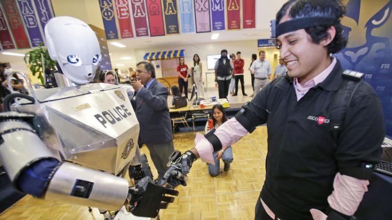 2.搖控機器人Telebot 佛羅里達國際大學探索實驗室(Discovery Lab)組成了一支本科生研究團隊,這支團隊后來研發(fā)出一個6英尺高、75磅重的機器人原型。這位名叫“Telebot”的機器人能夠幫助殘疾警官和軍事人員繼續(xù)擔當巡邏人員。Telebot配備了目前非常熱門的Oculus Rift增強現(xiàn)實裝置,將遠程控制技術與機器人技術結合在一起,可以通過特殊的穿戴裝置和手套來遠程控制機器人的動作,并且還能通過Oculus Rift和專用耳機接收Telebot所看到和聽到的信息。
