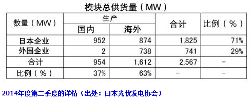 JPEA還宣布從2014年10月開始發(fā)布單月的供貨速報(bào)。之前的季度數(shù)據(jù)發(fā)布將于2014年末停止。2014年10月太陽能電池模塊的總供貨量為64.4018萬KW。