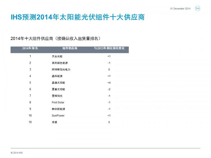 全球領(lǐng)先的太陽能光伏公司近期相繼公布了2014 年第三季度財報,包括今年最后一次重新發(fā)布對全年業(yè)績的預(yù)測。IHS 基于對光伏組件的全年出貨量預(yù)測,公布了2014年全球十大光伏組件供應(yīng)商排名預(yù)測。