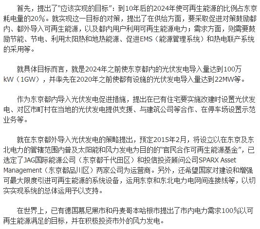 東京都11月27日發(fā)布了“東京都可再生能源擴(kuò)大研討會報(bào)告”。報(bào)告綜合了東京都可再生能源擴(kuò)大研討會(主席:東京工業(yè)大學(xué)特聘教授柏木孝夫)自2014年6月起舉行的4次研討會的內(nèi)容。