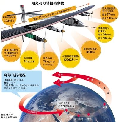整個環(huán)球飛行預(yù)計將耗時四到五個月,進(jìn)行25天左右的飛行。其中包括不使用任何燃油連續(xù)飛行5個晝夜,跨越海洋,從一個洲到達(dá)另外一個洲。整個環(huán)球飛行距離為3.5萬公里。