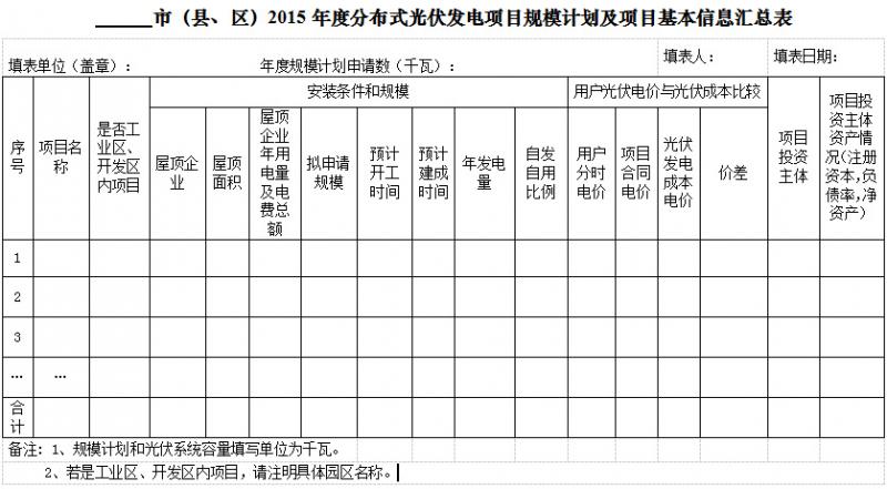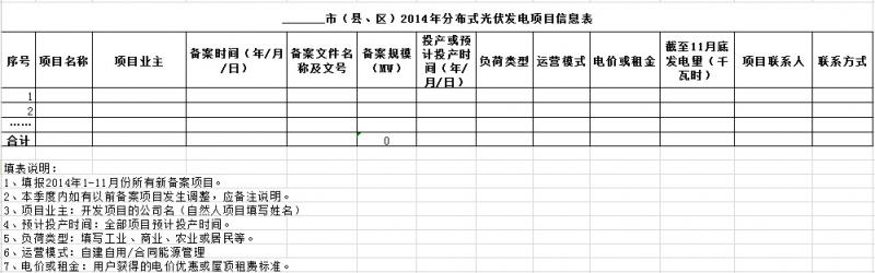根據(jù)《省發(fā)展改革委省工業(yè)信息化廳關(guān)于印發(fā)海南省企業(yè)固定資產(chǎn)投資項(xiàng)目省級(jí)備案目錄的通知》(瓊發(fā)改審批辦〔2014〕265號(hào))的規(guī)定,分布式光伏發(fā)電項(xiàng)目實(shí)行屬地備案管理,由項(xiàng)目所在地發(fā)展改革部門(mén)備案。根據(jù)國(guó)家對(duì)下達(dá)的規(guī)模指標(biāo)項(xiàng)目實(shí)行備案管理的要求,總投資不足500萬(wàn)元的分布式光伏發(fā)電項(xiàng)目,也應(yīng)辦理項(xiàng)目備案手續(xù)。請(qǐng)各地發(fā)展改革部門(mén)認(rèn)真總結(jié)2014年分布式光伏發(fā)電項(xiàng)目備案、建設(shè)和運(yùn)營(yíng)情況,填報(bào)《市(縣、區(qū))2014年分布式光伏發(fā)電項(xiàng)目信息表》(詳見(jiàn)附件3)。