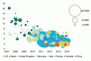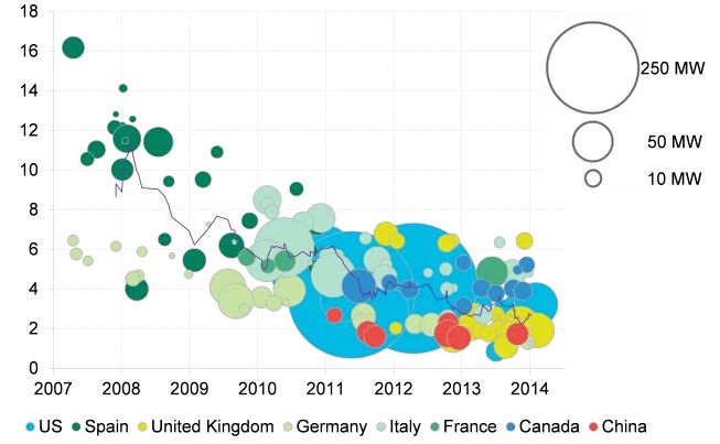 來源:彭博新能源財報告 氣泡大小代表項目的兆瓦規(guī)模
