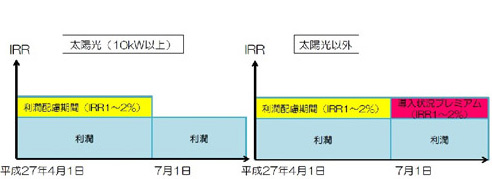 關(guān)于2015年6月底將要結(jié)束的優(yōu)待期,會議事務(wù)局也公布了提案:非住宅用光伏發(fā)電,由于導(dǎo)入速度在加速,所以在優(yōu)待期結(jié)束的6月底,將廢止提高1~2%的IRR(內(nèi)部收益率)制度。而住宅用光伏發(fā)電(10kW以下)和光伏以外的電力,則維持與此前相同個水平的IRR。從下次會議開始,將正式開始討論事務(wù)局公布的方案。