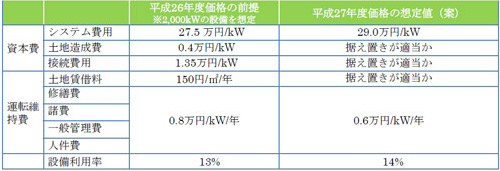 關(guān)于非住宅用光伏發(fā)電2015年度的設(shè)想值,事務(wù)局公布的方案如下:系統(tǒng)費用提高至29.0萬日元/kW(2014年度的設(shè)想值為27.5萬日元/kW)、設(shè)備利用率提高至14%(2014年度的設(shè)想值為13%)、土地平整費用為0.4萬日元/kW未變、并網(wǎng)費用為1.35萬日元/kW未變、運行維持費用下調(diào)至0.6萬日元/kW/每年(2014年度設(shè)想值為0.8萬日元/kW/每年),土地租金仍為150日元/m²/年。