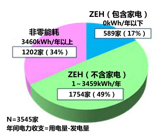 此次利用附帶通信功能的HEMS“Smart Heim Nabi”的數(shù)據(jù),分析了2013年1~12月入住“積水Heim”的3545戶住宅2014年全年的用電量、發(fā)電量和電力量收支情況。
