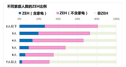 不含家電+含家電的ZEH達成率,“僅夫婦二人的家庭”為81%,“夫婦+孩子”為68%,孩子夫婦+父母為51%,呈家庭成員越少,達成率越高的趨勢。