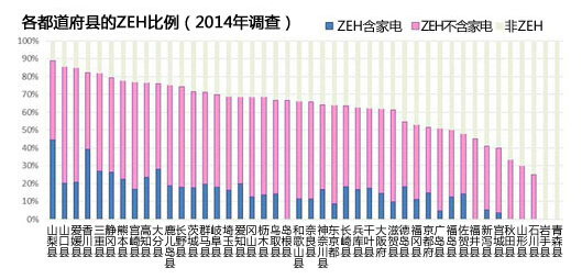 寒冷地區(qū)的ZEH也有擴大 2014年度的ZEH補助金條件為“建筑設(shè)備(空調(diào)、換氣扇、照明器具、熱水器)的一次能耗基本為零的住宅”,電視、洗衣機等家電及烹飪設(shè)備的用電量不屬于評估對象。這種“不含家電”的ZEH達成率由2013年的46%增加到了49%!安缓译姟焙汀昂译姟奔釉谝黄鸬腪EH達成率由2013年的59%增加到了66%。