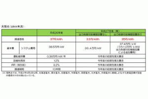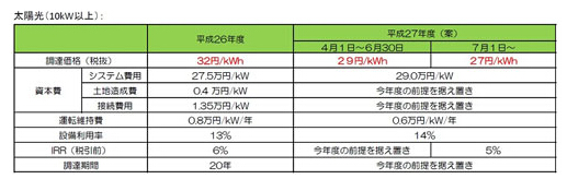 固定價格收購制度(FIT)在開始實行的前3年,是考慮重視運營商收益的“利潤優(yōu)待期”。因該優(yōu)待期于2015年6月30日結束,所以把估算的前提——IRR(內部收益率)由6%下調到了5%。由此,收購價格將分兩個階段下調。