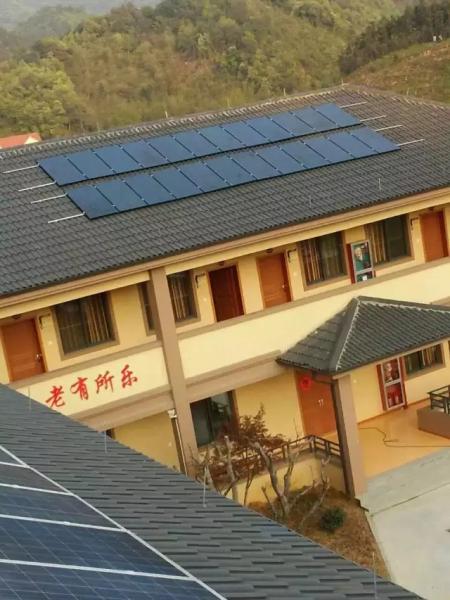 臨安板橋鎮(zhèn)敬老院背靠大山,周圍綠樹(shù)掩映,里面住著40多位老人。只見(jiàn)二層小樓的黑色瓦片屋頂上,分別整齊排列著兩排藍(lán)色太陽(yáng)能板,在陽(yáng)光的照射下分外好看。除此之外,位于太陽(yáng)鎮(zhèn)、龍崗鎮(zhèn)、清涼峰的三家敬老院的光伏發(fā)電系統(tǒng)也已安裝完成,其中板橋鎮(zhèn)、太陽(yáng)鎮(zhèn)已并網(wǎng)成功。每家敬老院的光伏發(fā)電系統(tǒng)的裝機(jī)容量均為10千瓦,今后將每年發(fā)電1萬(wàn)度左右,基本可以解決敬老院一年的用電問(wèn)題。福斯特公司捐贈(zèng)了四家臨安敬老院的全部光伏發(fā)電系統(tǒng),并委托協(xié)會(huì)會(huì)員單位杭州歐帆能源科技有限公司建設(shè)實(shí)施。