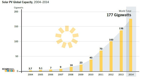 白皮書寫道,目前有164個(gè)國(guó)家采取了可再生能源扶持政策,這促進(jìn)了可再生能源的增長(zhǎng)。據(jù)REN21統(tǒng)計(jì),2014年的年間設(shè)置量約為135GW,為史上最高記錄,累積設(shè)置量已達(dá)到1712GW,比2013年增加8.5%。