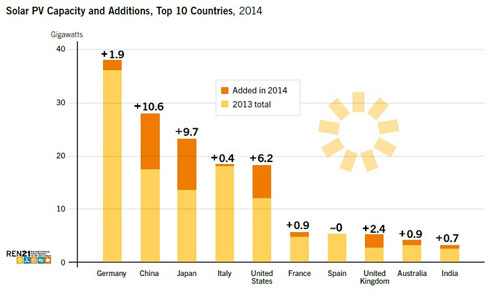 在可再生能源中,“光伏發(fā)電的增長(zhǎng)率最令人吃驚,2004年設(shè)置量為3.7GW,而2014年達(dá)到了177GW,10年增長(zhǎng)到了48倍”。2014年光伏發(fā)電增加量排名前三的國(guó)家依次為中國(guó)(10.6GW)、日本(9.7GW)和美國(guó)(6.2GW)。