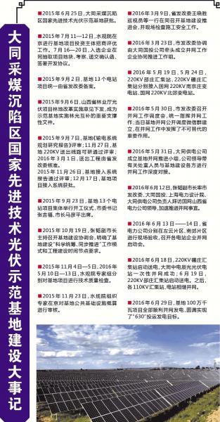 2015年9月,基地一期工程正式破土動工。為了實現(xiàn)打造“光伏新技術(shù)示范地、領(lǐng)跑技術(shù)實踐地、先進技術(shù)聚集地”的目標,我市在基地建設(shè)過程中,主動創(chuàng)新項目開發(fā)模式、創(chuàng)新企業(yè)招商模式、創(chuàng)新項目用地模式、創(chuàng)新技術(shù)引領(lǐng)模式、創(chuàng)新工程建設(shè)模式、創(chuàng)新項目服務(wù)模式、創(chuàng)新持續(xù)領(lǐng)跑模式、創(chuàng)新共享發(fā)展模式,成功破解了投資、技術(shù)、用地等一系列難題。各參建單位在市采煤沉陷區(qū)光伏示范基地建設(shè)領(lǐng)導(dǎo)組的統(tǒng)一指揮協(xié)調(diào)下,針對建設(shè)周期短、施工難度大、高效組件交貨期緊等實際情況,采取電站建設(shè)與送出工程協(xié)同進行、技術(shù)領(lǐng)跑與進度領(lǐng)跑雙管齊下等辦法,戰(zhàn)嚴寒、斗酷暑,全力以赴加快項目建設(shè)進度,順利實現(xiàn)了基地一年內(nèi)開工建設(shè)、并網(wǎng)投運的目標。