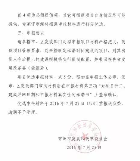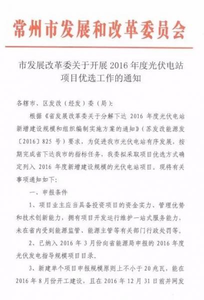 2016年7月25日,江蘇常州市發(fā)改委下達《2016年度光伏電站項目優(yōu)選工作通知》。通知要求2016年7月29日前報送相關材料, 未按承諾時間建設的項目將采取限制措施。