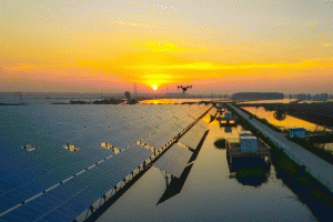 2016年8月23日,無(wú)人機(jī)正在華東最大的水上光伏發(fā)電基地,位于江蘇興化李中鎮(zhèn)蘇宋村的華電(興化)太陽(yáng)能發(fā)電項(xiàng)目檢查光伏設(shè)備運(yùn)行情況。