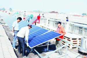 10月8日上午,工人正在宿豫區(qū)關(guān)廟鎮(zhèn)趙莊小區(qū)安裝光伏發(fā)電設(shè)備。關(guān)廟鎮(zhèn)和通威集團合作,在趙莊小區(qū)利用居民房頂免費安裝小型太陽能發(fā)電系統(tǒng)裝置,發(fā)展低碳生態(tài)環(huán)保產(chǎn)業(yè),建設(shè)蘇北首家光伏小區(qū)。