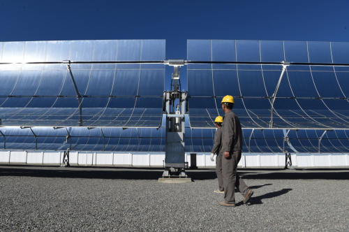 10月12日,技術(shù)人員在測試平臺換熱區(qū)進(jìn)行巡檢。當(dāng)日,高溫熔鹽槽式光熱發(fā)電項目測試平臺在甘肅省阿克塞哈薩克族自治縣并網(wǎng)投運。該測試平臺項目是國家能源局確定的第一批太陽能熱發(fā)電示范項目——甘肅阿克塞50兆瓦高溫熔鹽槽式光熱發(fā)電項目的先導(dǎo)項目,包含了集熱、儲熱、換熱、發(fā)電等光熱電站的全部功能,測試平臺并網(wǎng)投運為大規(guī)模建設(shè)高溫熔鹽槽式光熱發(fā)電項目提供了前期樣板和技術(shù)保障。