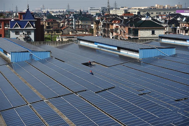 1月20日,國家電網(wǎng)杭州蕭山區(qū)供電公司工作人員在杭州帝凱工業(yè)布有限公司的光伏屋頂,檢查光伏設(shè)備并網(wǎng)運行情況。