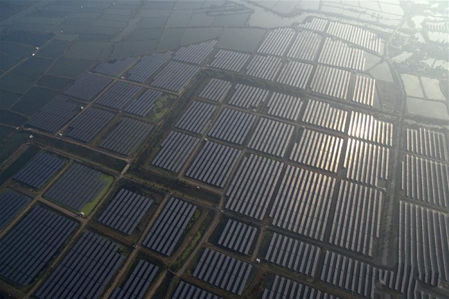 這是2016年12月3日航拍的位于浙江省湖州市南潯區(qū)和孚鎮(zhèn)漾東村的100兆瓦光伏發(fā)電項目。據(jù)了解,該項目占地4000多畝,30多萬塊光伏組件架設(shè)在總面積2400畝的魚塘上方。 據(jù)統(tǒng)計,至2016年底,浙江太陽能發(fā)電裝機容量達(dá)338.2萬千瓦,年發(fā)電量22.2億千瓦時,同比增長189.9%。