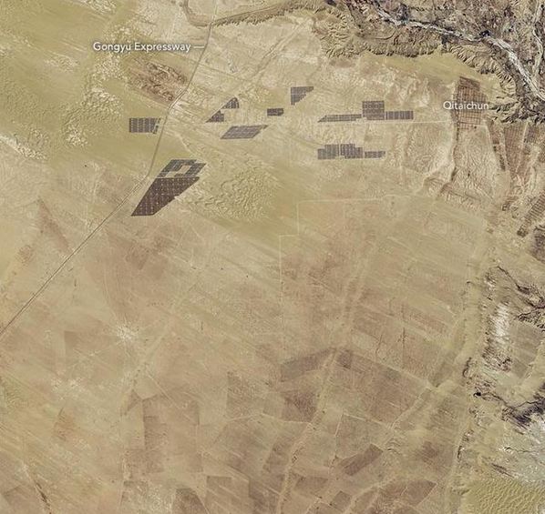 衛(wèi)星圖片展示了龍羊峽太陽(yáng)能發(fā)電場(chǎng)在四年內(nèi)的增長(zhǎng)情況。到2017年1月5日,太陽(yáng)能電池板覆蓋了青海省27平方公里。據(jù)報(bào)道,在2017年在該區(qū)域有近400萬(wàn)塊太陽(yáng)能電池板。