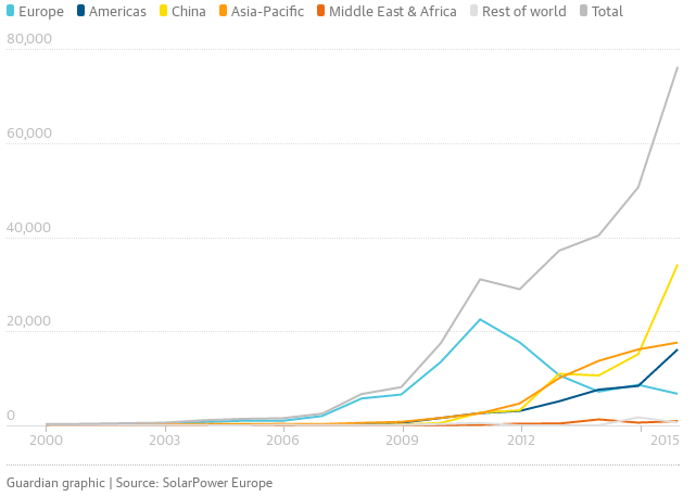 在陽光充裕的地區(qū),太陽能被視為最易安裝和獲取的綠色能源。當前全球光伏發(fā)電板總裝量已達 305 吉瓦左右,而在 2010 年的時候,這一數(shù)字還僅為 50 吉瓦!缎l(wèi)報》的報道稱,中美兩國主導著該領(lǐng)域的發(fā)展,在 2016 年的增速都較 2015 年幾乎翻番;同期全球增量僅為 80 GW,2015 增量僅為 50 GW
