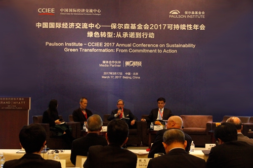 3月17日,在中國國際經(jīng)濟交流中心與保爾森基金會共同主辦的2017可持續(xù)性年會上,美國前財政部長、保爾森基金會主席亨利·保爾森(Henry M. Paulson, Jr.)、中國國際經(jīng)濟交流中心理事長曾培炎、中國氣候變化事務特別代表解振華以及來自中美兩國的政府官員、杰出行業(yè)專家和知名學者齊聚一堂,共同探討中國向綠色經(jīng)濟轉(zhuǎn)型所面臨的機遇和挑戰(zhàn)。林恩·斯嘉麗為美方代表之一。