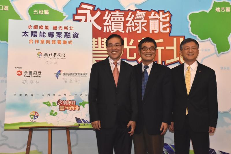 永豐銀行與新北市簽署太陽能專案融資合作。左至右:TVPIA 理事長張秉衡、新北市經(jīng)發(fā)局副局長黃正誠、永豐銀行總經(jīng)理魏哲弘。(來源:新北市政府)