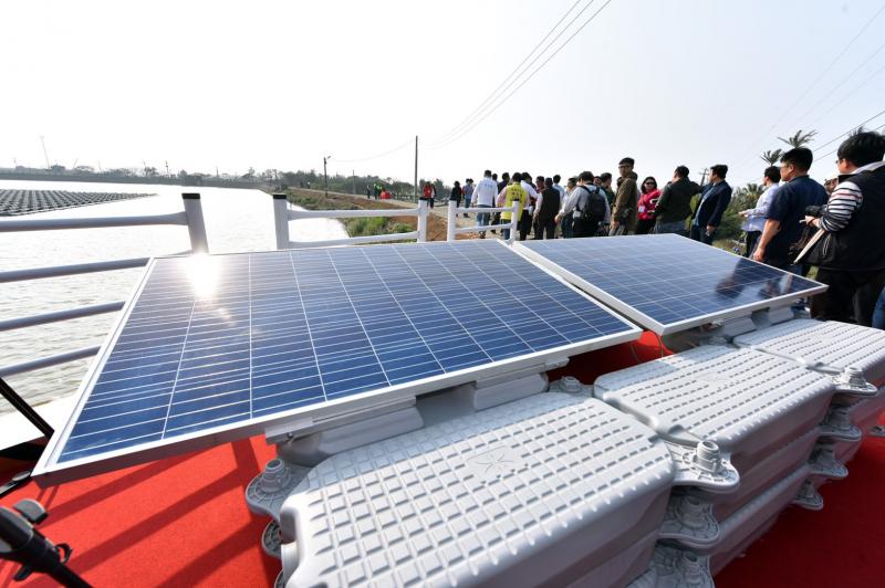 桃園市政府與臺灣中央政府官員視察桃園埤塘建置的漂浮型太陽能系統(tǒng)。來源:桃園市政府