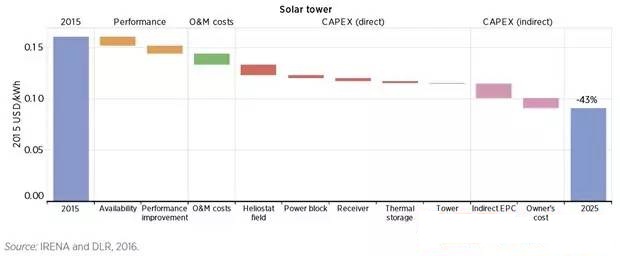 圖:塔式光熱電站2025年之前的成本下降曲線(數(shù)據(jù)來(lái)自IRENA 2016年發(fā)布的報(bào)告)