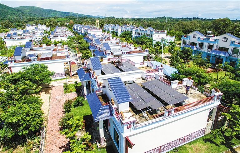 6月13日,低空俯瞰陵水黎族自治縣隆廣鎮(zhèn)石關(guān)村常皮村村民小組,村民房頂?shù)墓夥l(fā)電系統(tǒng)已并網(wǎng)發(fā)電。