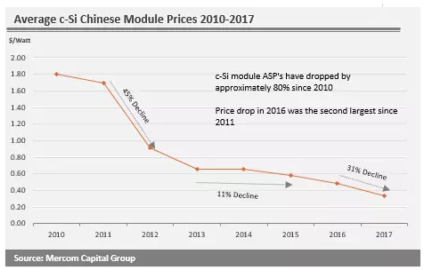 印度光伏報價節(jié)節(jié)走低與中國制造的光伏電池、組件價格下降密切相關(guān)。2010年到2017年,中國生產(chǎn)的晶硅光伏組件下降了80%。2016年下降了31%,是近年來下降幅度最大的一年。