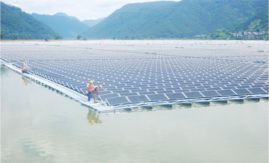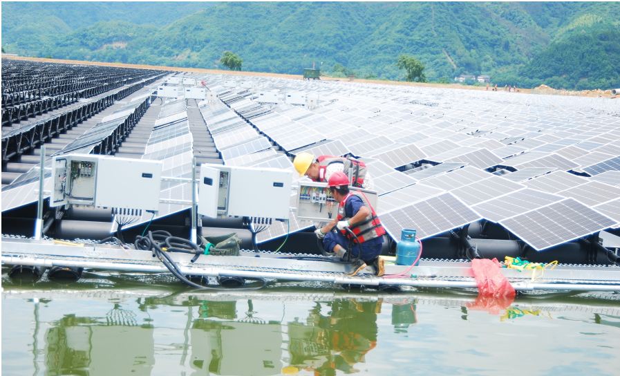 7月3日,建德市三都鎮(zhèn)春江源村水面的漂浮式光伏電站示范項目建設(shè)工地。這項工程計劃在7月中旬前并網(wǎng)發(fā)電。工程總投資1.7億元,租用三都鎮(zhèn)春江源村420畝魚塘,做到漁光互補,清水養(yǎng)魚,年發(fā)電量可達(dá)2000萬度。(浙江在線拍友 寧文武 攝)