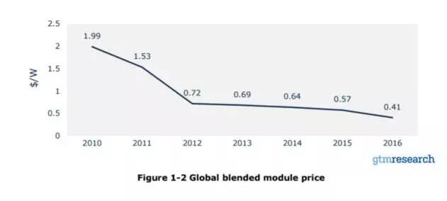 根據(jù)GTMResearch的數(shù)據(jù),2010年全球光伏組件平均成本為1.99美元/瓦,到2012年迅速降至0.72美元/瓦;此后繼續(xù)下降,到2016年降至0.41美元/瓦。與2010年相比,2016年光伏組件平均成本下降79.4%。