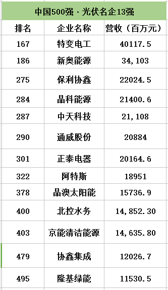 其中,中國(guó)光伏企業(yè)也表現(xiàn)不俗。值得注意的是,中國(guó)13家光伏企業(yè)(涉足投資的企業(yè)暫除外)強(qiáng)勢(shì)登陸了500強(qiáng)榜單。其中,排名最靠前的是特變電工,營(yíng)收破400億元。新奧能源和保利協(xié)鑫位列第二名和第三名。同時(shí),協(xié)鑫集成、隆基股份兩家上市公司首次進(jìn)入了此榜單;通威股份和正泰電器分別從上年的367名、414名躥升至290名、301名。
