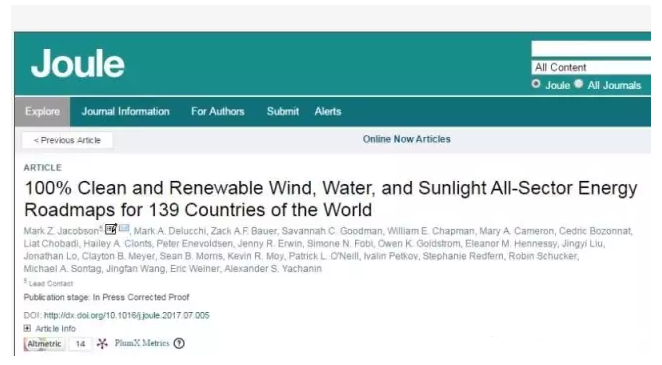 以“100%可再生能源可行論”而著稱(也因此而備受質(zhì)疑)的斯坦福教授Mark Jacobson日前在《焦耳》(Joule)雜志上再度發(fā)表文章,為全球139個國家設(shè)計了實現(xiàn)100%可再生能源路線圖,在各個領(lǐng)域(包括交通、供熱供冷、工業(yè)、農(nóng)業(yè)等)全面實現(xiàn)電力替代,以水力(water)、風(fēng)電(wind)、太陽