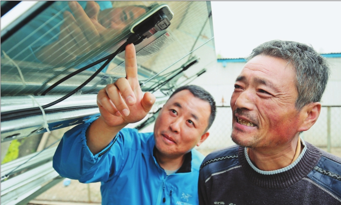 50歲的劉安奎(右)是光伏扶貧項目的受益者。