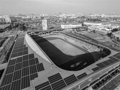 在江蘇揚中,無論是企業(yè)、居民還是政府單位,各類場所的屋頂上,太陽能電池板的身影隨處可見。2016年,該市萬元GDP能耗0.3257噸標準煤,僅為江蘇省平均值的一半左右,二氧化碳排放量、主要污染物排放強度均低于全省平均水平。揚中奧體中心屋頂光伏發(fā)電項目在揚中,綠色能源企業(yè)多達近百家,其中光伏及配套企業(yè)就有近50家。圖為江