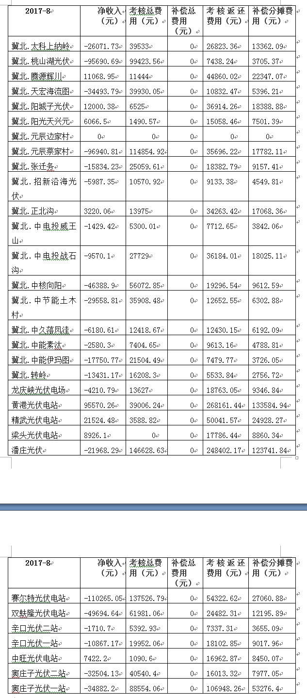 2017年8月京津唐光伏電站并網(wǎng)運行結(jié)算匯總表