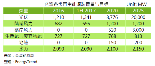 臺(tái)灣擁有雄厚的能源技術(shù)作為發(fā)展可再生能源的基礎(chǔ)。臺(tái)當(dāng)局制定了2025非核家園的目標(biāo),并將可再生能源發(fā)電占比目標(biāo)提高到20%、發(fā)電機(jī)組比例40%。如此遠(yuǎn)大的目標(biāo),需要臺(tái)當(dāng)局與民間共同努力達(dá)成! 「鶕(jù)EnergyTrend調(diào)查,臺(tái)灣目前各項(xiàng)可再生能源裝置量與2025年目標(biāo)距離不小,其中光伏的達(dá)標(biāo)率僅有6.8%、風(fēng)力發(fā)電僅1