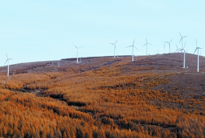 10月23日拍攝的河北張家口市壩上崇禮區(qū)一處山上的風(fēng)力發(fā)電場。陳曉東攝