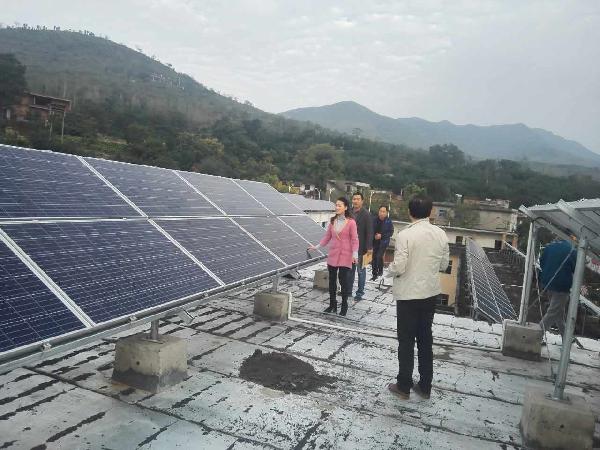 在府店鎮(zhèn)佛光村委會(huì)和小學(xué)的房頂上,一塊塊藍(lán)色的光伏電池板,在陽光照射下熠熠生輝,今年6月份,隨著總裝機(jī)容量4.61MW光伏發(fā)電站一期的并網(wǎng),閑置的樓頂成為貧困戶的“搖錢樹”,通過產(chǎn)業(yè)脫貧成為致富的新亮點(diǎn)。