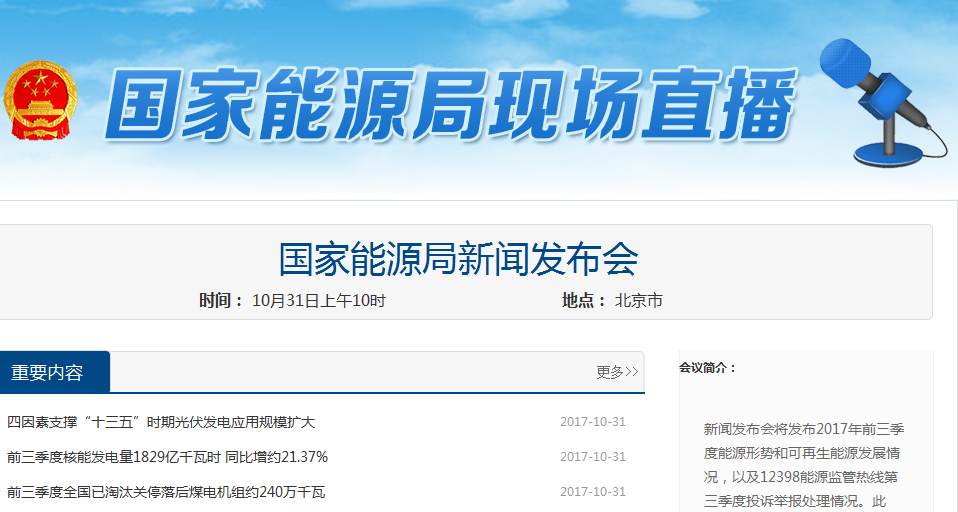 10月31日上午10時(shí),國(guó)家能源局召開新聞發(fā)布會(huì)介紹2017年前三季度能源形勢(shì)和可再生能源發(fā)展情況,以及12398能源監(jiān)管熱線第三季度投訴舉報(bào)處理情況。