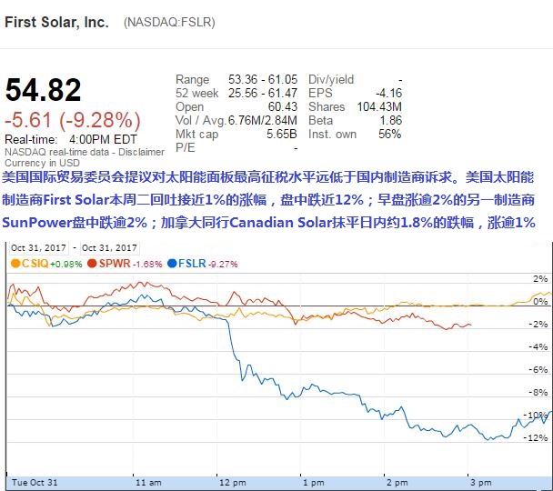 本周二ITC提議公布后,美國太陽能制造商領(lǐng)頭羊股價明顯走低。